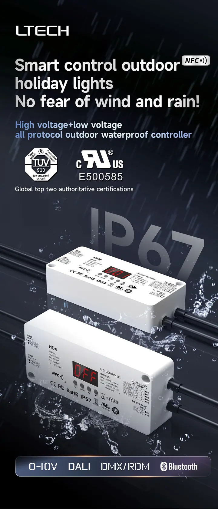 Outdoor lighting environments pose complex challenges such as wind, rain, humidity, and difficult debugging conditions. LTECH’s newly launched Outdoor Waterproof Controller Series brings professional-grade intelligence and reliability to outdoor lighting installations. With IP67 waterproof protection, multi-protocol compatibility, and NFC programming, this series provides seamless smart control in any weather.