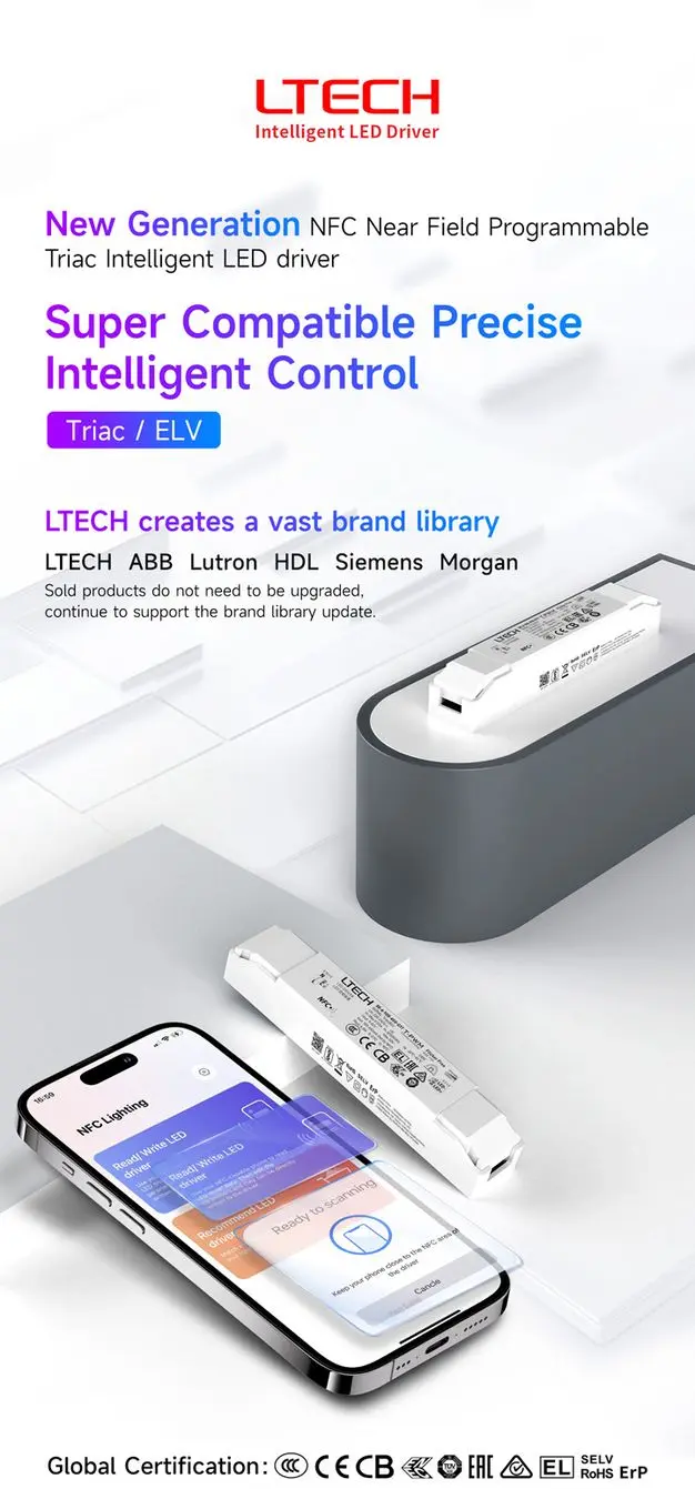 LTECH introduces its new NFC Near Field Programmable Triac Intelligent LED Driver, designed for precise current control and effortless configuration. The driver offers cutting-edge NFC programming technology, allowing quick parameter adjustments directly from a smartphone app without physical contact or manual dial codes.