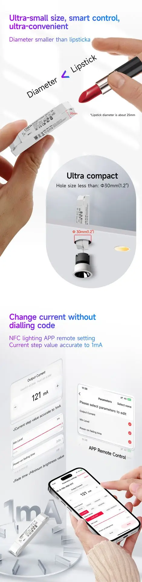 The NFC programming feature replaces traditional mechanical adjustments, providing current tuning accuracy down to 1mA. Parameters such as fade time, power-on brightness and dimming response can all be set directly from the LTECH mobile app.