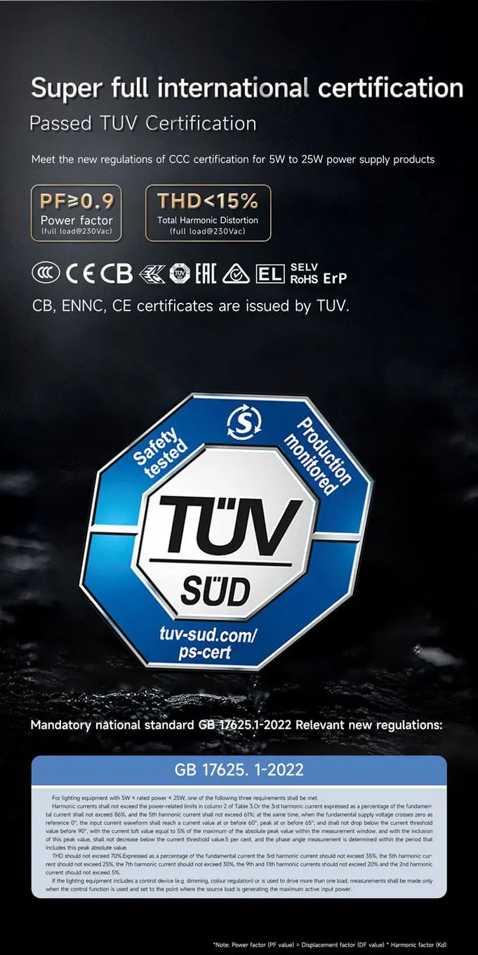 The driver meets the latest TÜV and ErP standards, achieving a power factor ≥0.9 and THD <15% at full load. It holds multiple international certifications including CE, CB, ENEC, EAC, RoHS and SELV, ensuring safe and compliant operation worldwide.