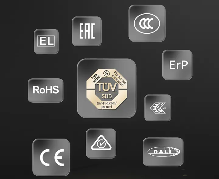 Built to meet global engineering requirements, the LF Series holds over 10 international certifications, including CE, TUV, RoHS, EAC, ErP, EL, and DALI-2.