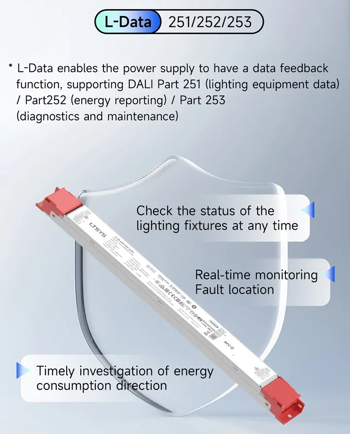 The LF Series integrates L-Data (DALI Part 251/252/253) for real-time energy and diagnostic monitoring.