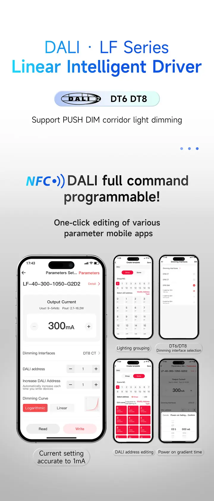Its NFC near-field programming enables one-click configuration through a smartphone, giving lighting designers full control over parameters like DALI address, output current, and dimming curves.