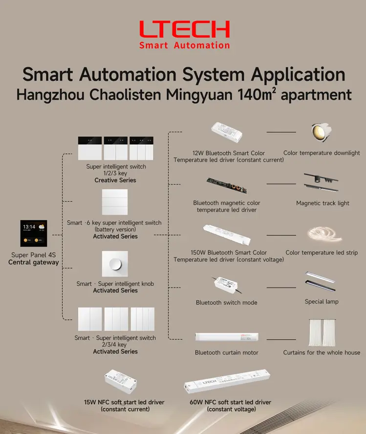 LTECH has developed a full smart automation solution designed to transform any modern home into an intelligent living environment. The system integrates lighting, curtains and customized scene controls through a network of Bluetooth 5.0 Mesh-connected devices.