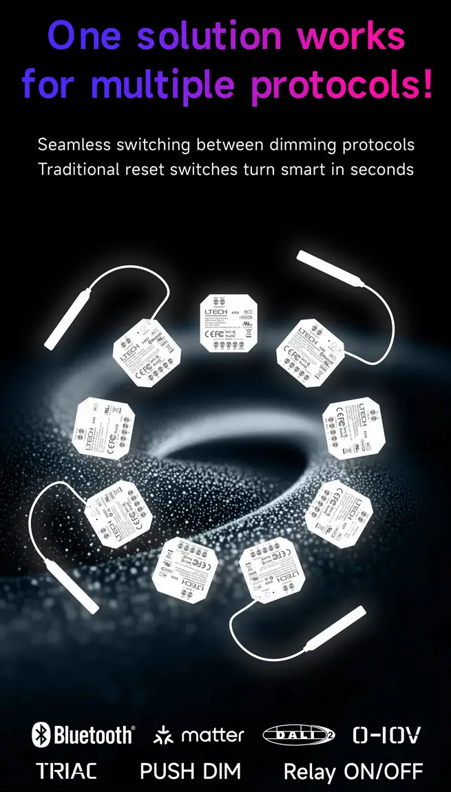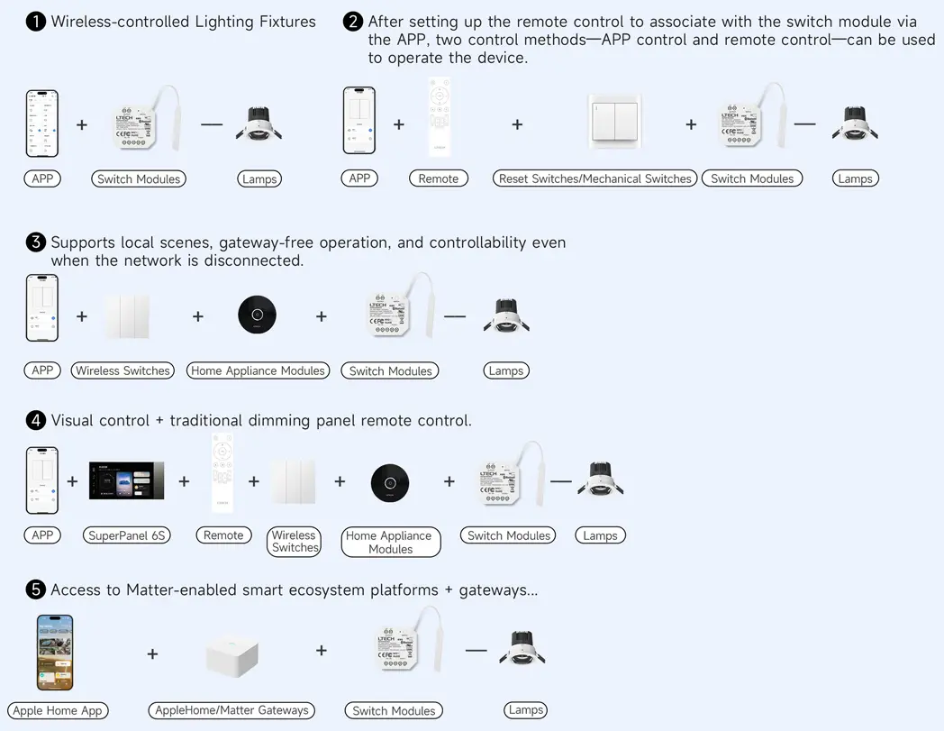 - Bluetooth 5.0 SIG Mesh: Enables wireless control through the L-Home app, Super Smart Panels, and LTECH smart gateways. Users can manage scenes, timing, and automation with ease.
